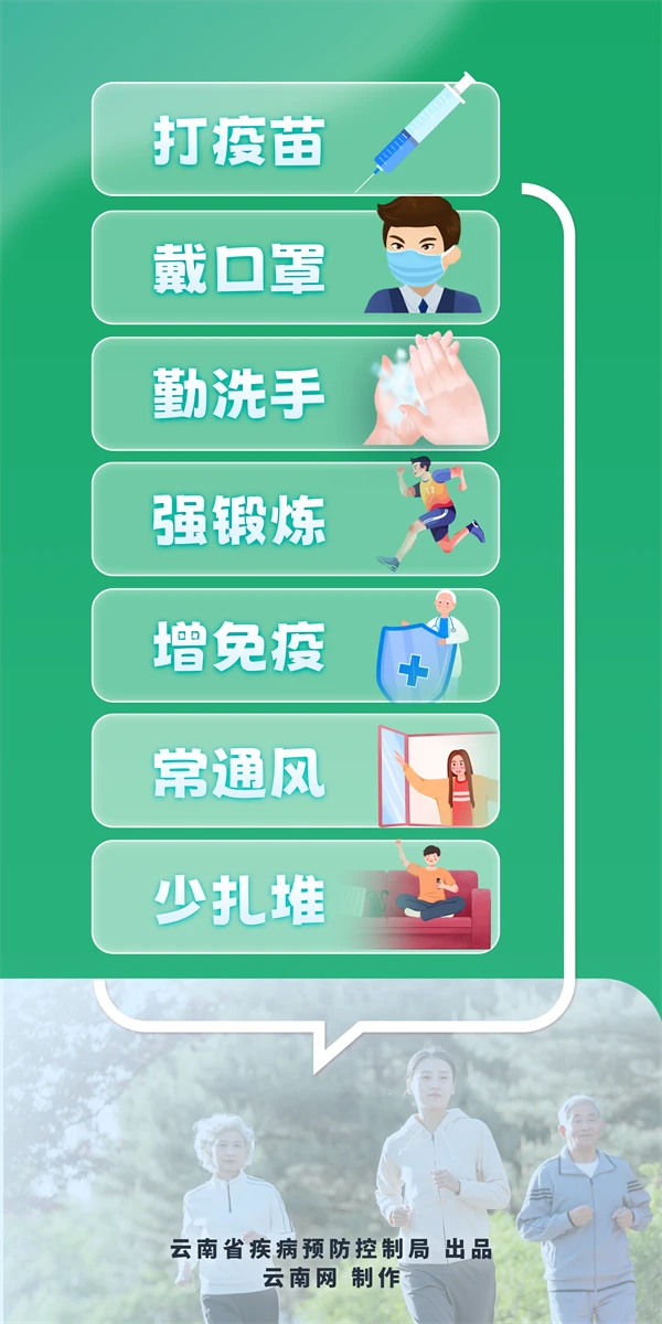 防控流感,预防大于治疗。接种流感疫苗是最科学、经济、有效的核心手段,每年接种可显著降低感染风险,减轻症状、阻断传播,还能降低重症与死亡风险。此外,日常防护也不能少,打疫苗、戴口罩、勤洗手、强锻炼、增免疫、常通风、少扎堆,从细节筑牢健康防线。