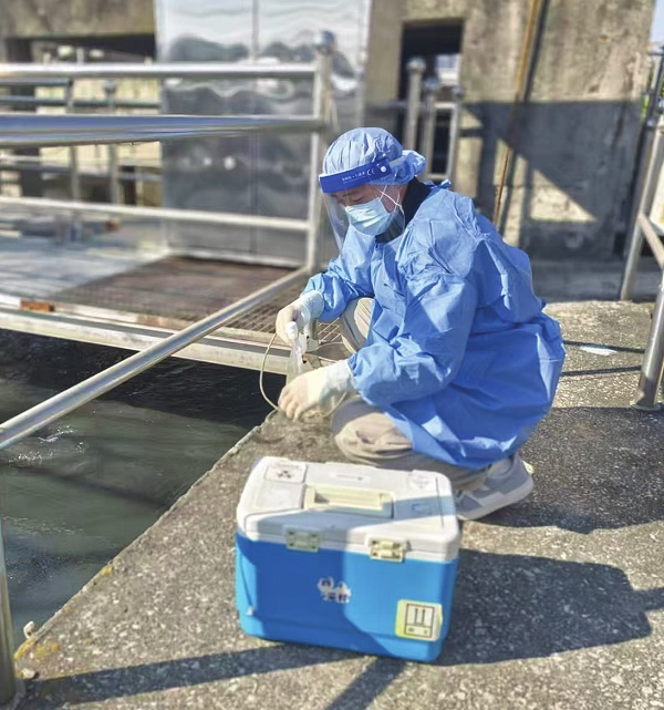 云南省昆明市西山区疾控中心传染病防治科科员张亚谋在昆明市第十三水质净化厂采集水样。西山区疾控中心 供图
