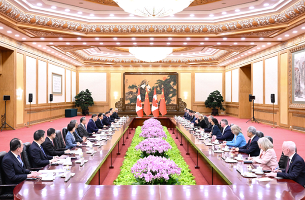 习近平指出,去年10月,我们在韩国庆州会见,开启了中加关系转圜向好的新局面。双方就恢复和重启各领域合作深入探讨,取得积极成果。中加关系健康稳定发展符合两国共同利益,也有利于世界和平稳定和发展繁荣。双方要本着对历史、对人民、对世界负责任的态度,推进构建中加新型战略伙伴关系,推动中加关系迈入健康、稳定、可持续的发展轨道,更好造福两国人民。