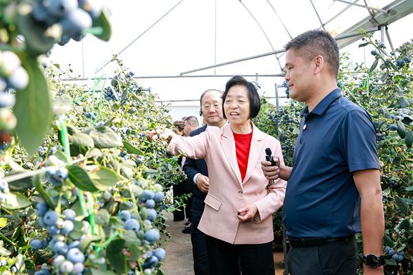 调研组一行在澄江绿康蓝莓基地了解联农带农增收入等情况。